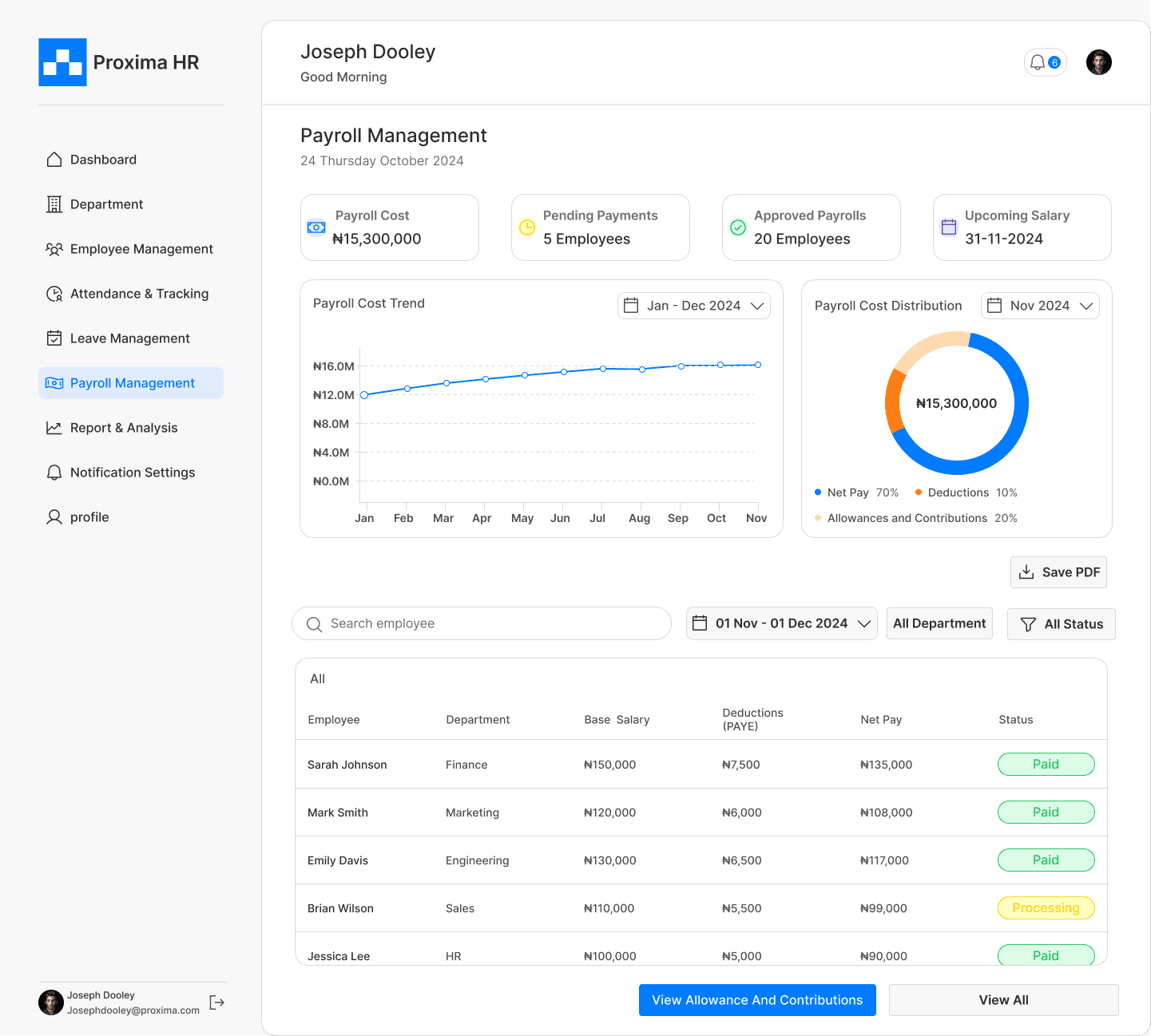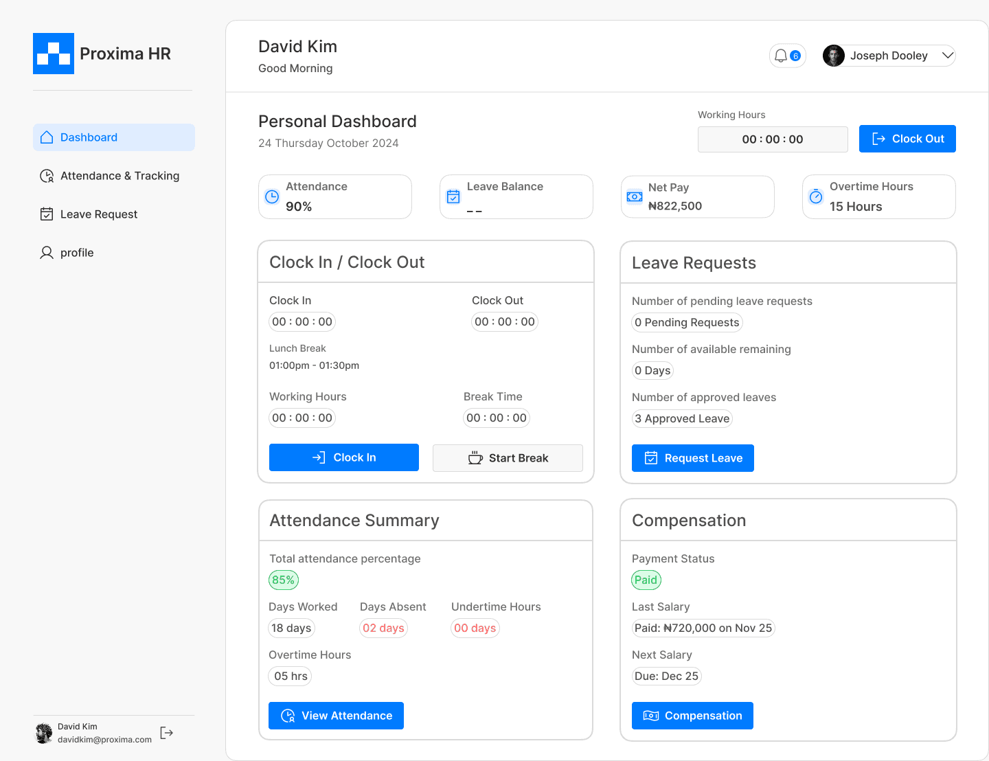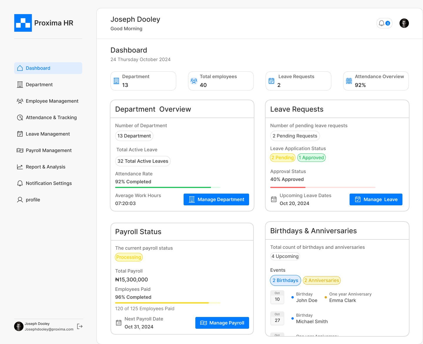 ProximaHR is an HR management system that brings employee data, attendance tracking, payroll, and task management into one simple and easy-to-use platform.